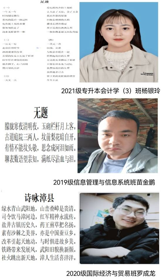 本次活动受到经济与信息管理学院19级、20级、21级及21级专升本各班同学积极响应、踊跃参与,共接收稿件128份。在来稿的文章中同学们用笔向革命先烈表达深深敬意,以当代青年学生的视角阐述了清明节的意义不仅仅在于缅怀逝者,更在于善待生者,珍惜与家人朋友相处的每一分每一秒。作品收集完毕后,院评委老师肯定了所有参赛者对此次活动付出的努力,对参赛者的作品做了仔细的分析,从诗歌形式的韵律性、诗歌内容的新颖性等方面认真且慎重的评选出了27份入围作品。由工作人员在“美篇”微信公众平台对入围作品发起线上投票,投票日期2022年4月7日-4月15日,投票期间浏览量高达1.2万,总共投票数为2736票,最终经过网络投票的结果评选出一等奖两名,二等奖三名,三等奖五名,优秀奖五名。