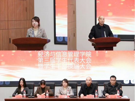 为了更好的开展学院各项活动,我院于2023年11月8日晚19点30分在综合教学楼学术报告厅隆重举行经济与信息管理学院学生代表大会暨学生干部换届大会。出席本次会议的有经济与信息管理学院党委书记兼院长张利、副院长刘炳田、陈学红,党委副书记赵磊、团总支常务副书记唐凌洁及各辅导员老师,还有来自学校校团学会代表、各社团代表、各学院学生分会代表、我院各班级的学生代表。