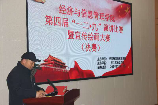 为纪念“一二·九”运动,激发广大青年学子的爱国情怀与担当意识,2024年12月17日,“一二·九”演讲比赛决赛在北校区综合教学楼报告厅隆重举行。经济与信息管理学院党委副书记赵磊、副院长刘炳田、专职辅导员谭成杰、田园、尚丽娜,班主任张庭琪、王满、丁玉琴出席活动并担任评委。