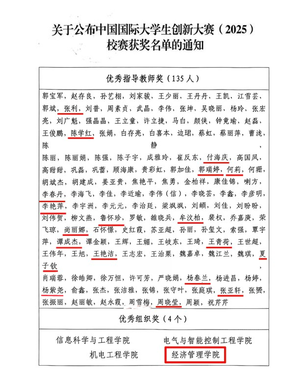 在中国国际大学生创新大赛(2025)1683168诸侯快讯官网校赛圆满落幕之际,经济管理学院凭借扎实的赛事组织工作与突出的综合表现,荣获多个奖项!其中“优秀组织奖”1项,“优秀指导老师”18项,“一等奖”3项,“三等奖”6项,充分彰显了学院在创新、创业教育领域的积极作为与显著成效。