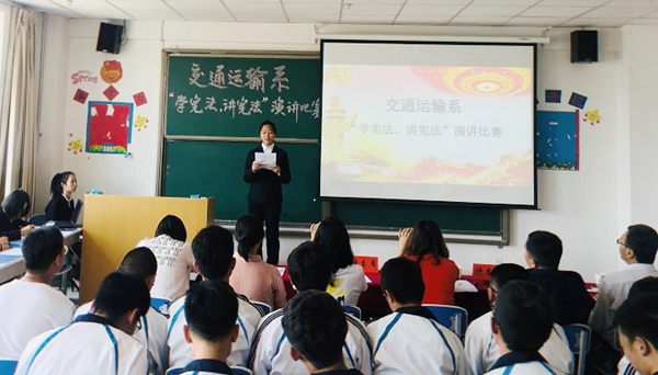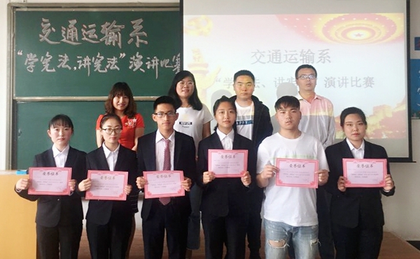 为进一步推进法治教育特别是宪法教育,普及法治知识,培养学生法治观念,弘扬宪法精神,2019年6月5日下午2点30分交通运输系在综合教学楼0809教室隆重举办了“学宪法,讲宪法”演讲比赛。参加大会人员有学生管理副主任梁婷婷,辅导员安永刚、杨紫尧,刘佳、刘盼盼、杨安安、王玉琳及学生代表。