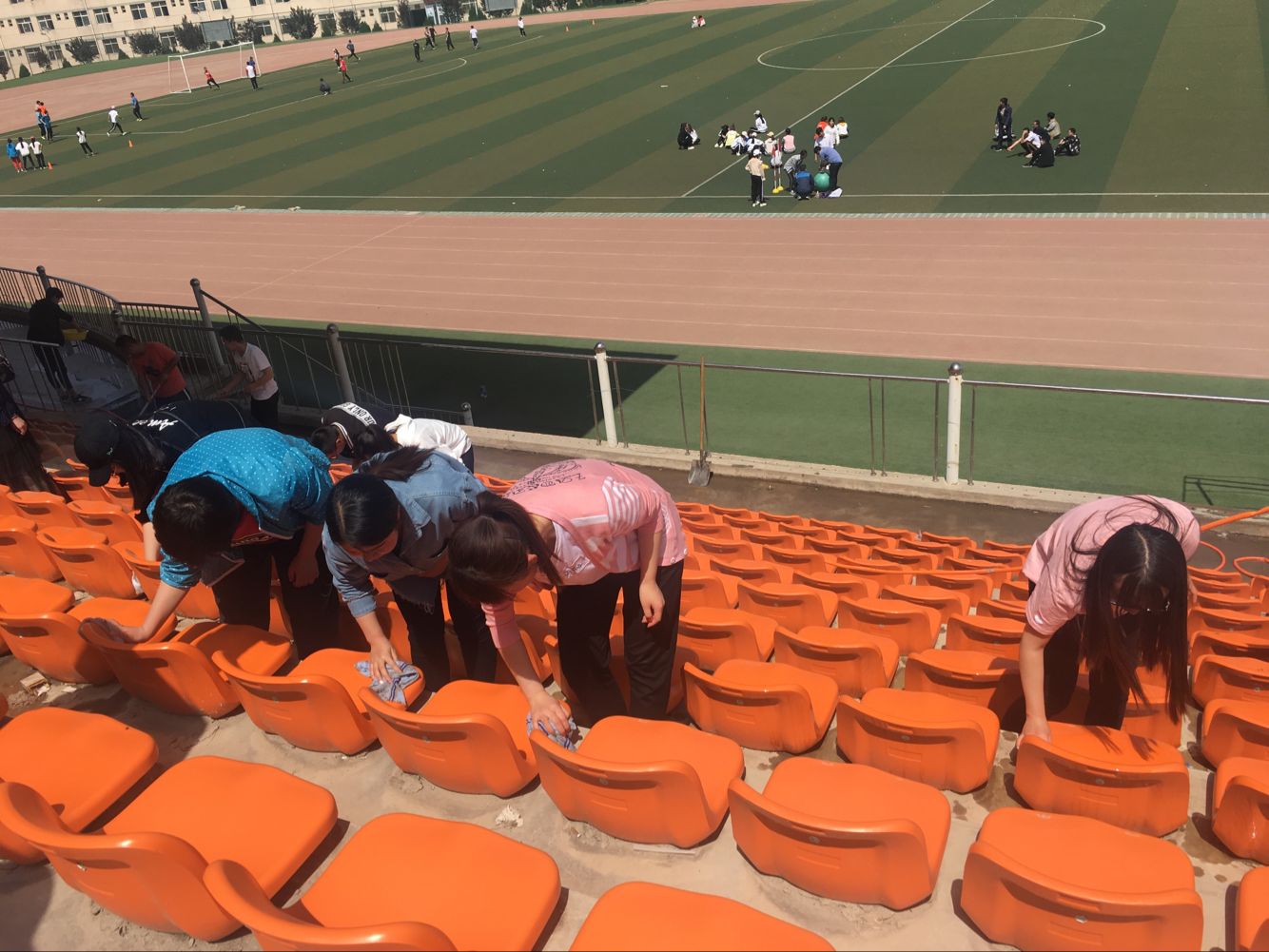 活动现场,交通运输系学生党员志愿者们手拿扫帚、水桶、抹布、拖把等劳动工具,对主席台各个角落及看台坐席座位进行了全面清理,大家分工协作,有的洒水,有的抬水,有的扫地,有的擦主席台,有的清理垃圾,每个成员都干劲十足。现场一派热火朝天的景象,在活动中,党员及入党积极分子始终发扬不怕脏,不怕累的工作精神,积极认真的为环境的洁净尽自己最大的一份力量,经过全体人员的努力,主席台及座席上的灰尘被清扫的干干净净,环境卫生焕然一新。