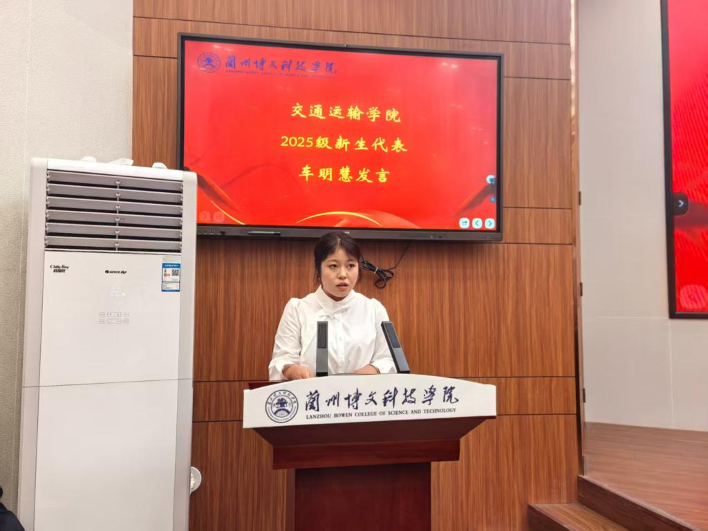 最后,2025级新生代表车明慧同学代表全体新生发言。她表达了对大学生活的憧憬与期待,也代表新生们作出承诺:“我们将以饱满的热情投入学习,以开放的心态拥抱新生活,以积极的行动传承学长学姐的优良传统,不负学校的培养,不负父母的期望,更不负自己的青春年华。”