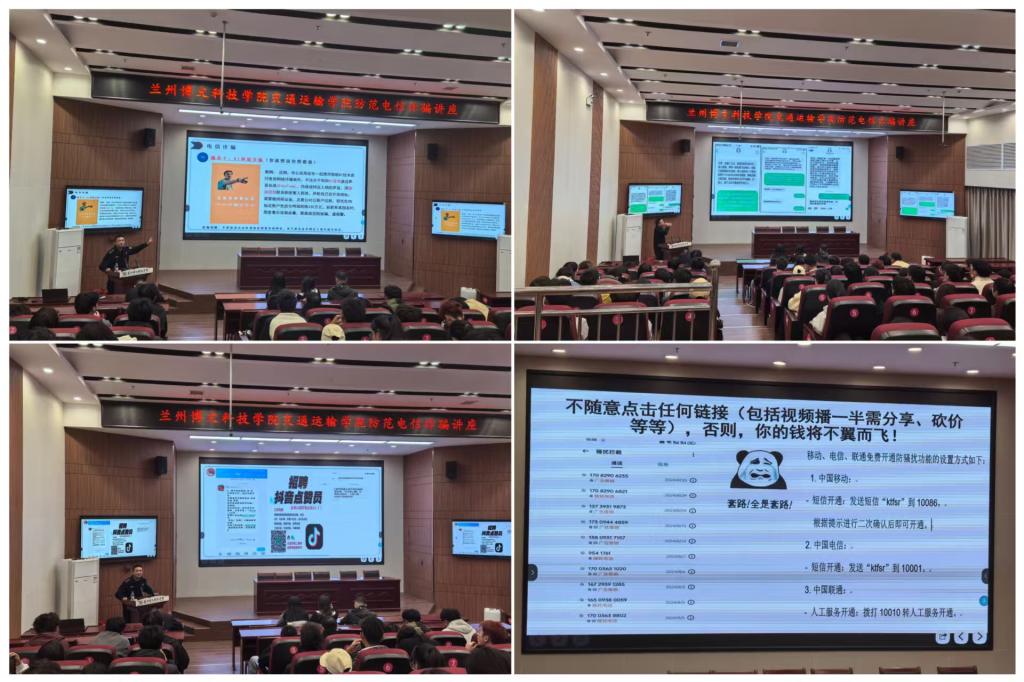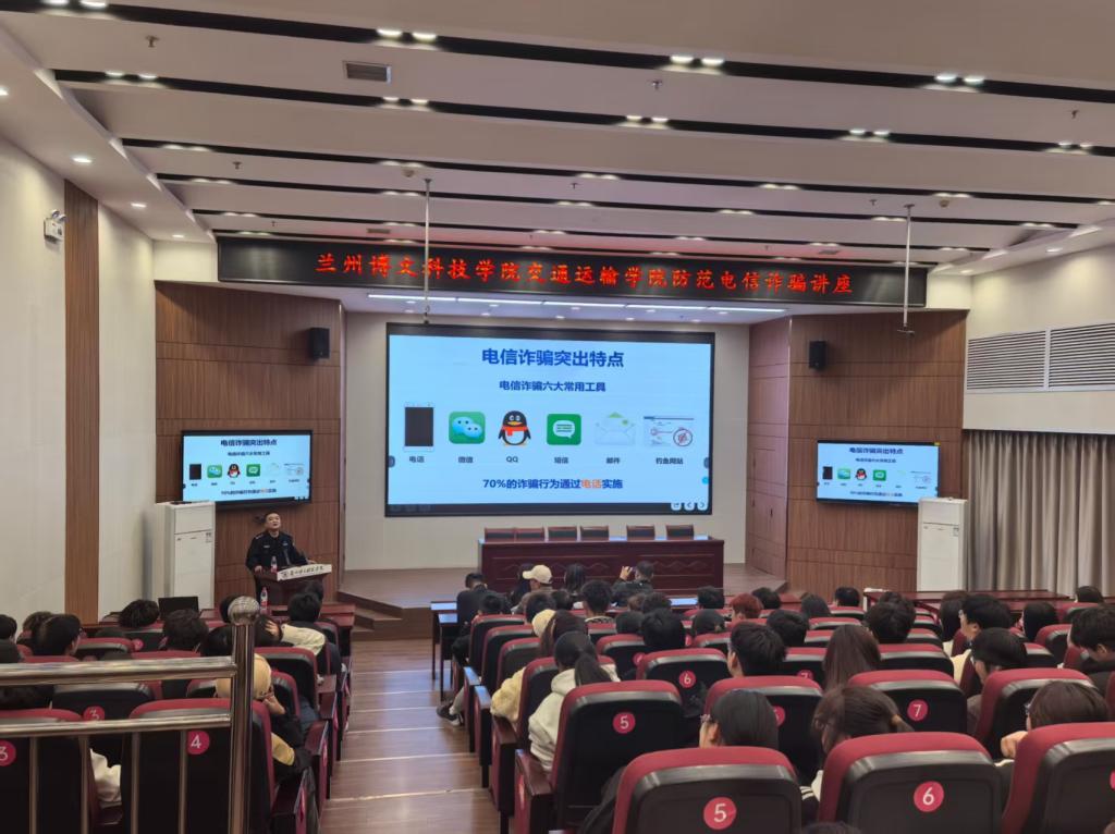 为切实提升大学生防诈反诈意识与自我保护能力,有效遏制校园诈骗案件高发态势,11月3日交通运输学院特邀榆中县安局反诈中心主任陈冠宇警官,为全院师生带来了一场主题鲜明、内容详实的防诈骗专题讲座。学校保卫处处长王正茂、交通运输学院学生管理副院长、全体辅导员及2025届全体大一新生参加现场学习氛围浓厚。