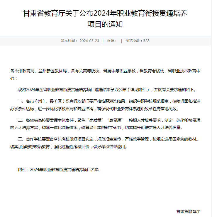 近日,甘肃省教育厅发布了《甘肃省教育厅关于公布2024年职业教育衔接贯通培养项目的通知》,我校电气工程及其自动化专业与兰州理工中等专业学校机电技术应用专业成功达成合作意向,获批“3+4”中职与本科贯通培养项目。