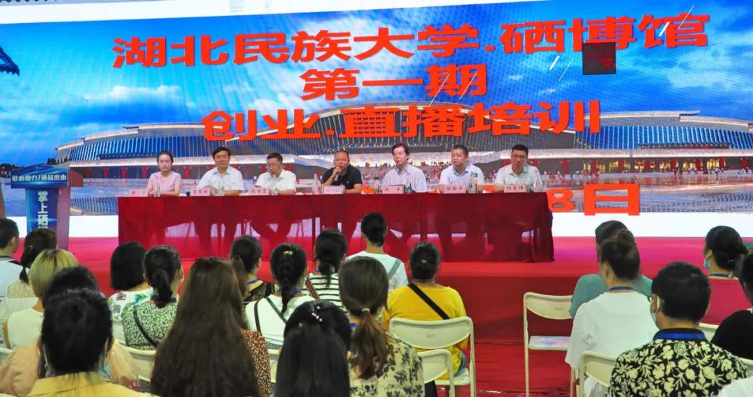 728日,在州人力资源和社会保障局、州硒资源保护与开发中心、州公共就业和人才服务局的指导下,由金年会和州文化中心硒博馆共同举办的第一期“千星万红”创业·直播带货培训开班典礼在硒博馆顺利举行。jinnian金年会继续教育学院院长雷随斌,恩施聚硒商业管理有限公司董事长周才红、总经理张国富,人社部国家级项目培训导师陈平、陈徐平、杨复伟和来自恩施各县市的120余名培训学员出席开班典礼。