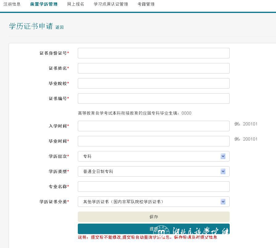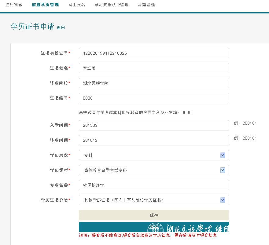 以下页面输入专科毕业证信息,学历证书分类选择“其他学历证书”,点击提交即可通过,必须点击提交,点击保存是无效的: