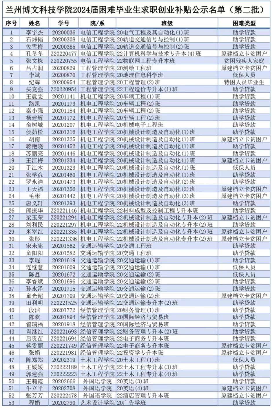 兰州博文科技学校2024届困难毕业生求职创业补贴公示名单(第二批)
