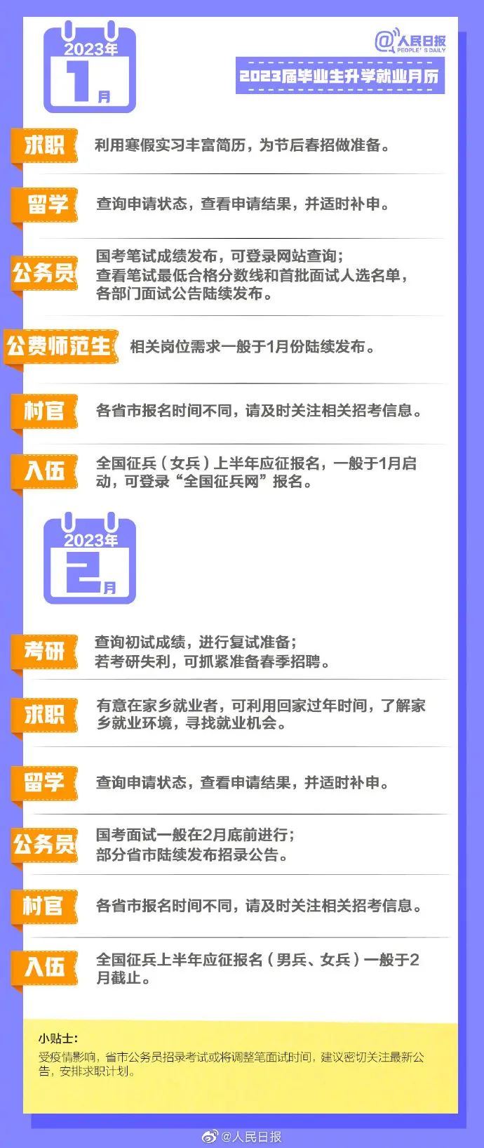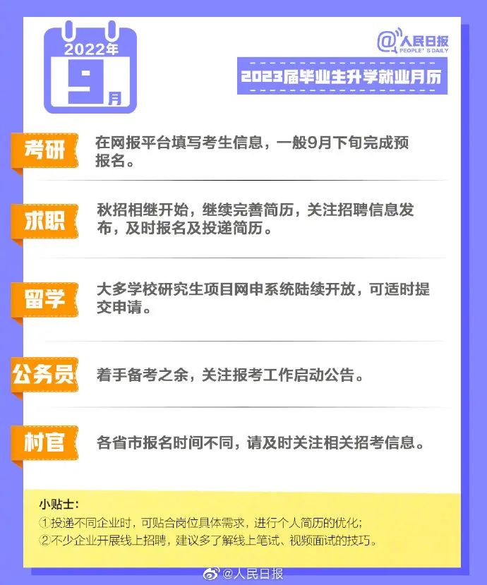 随着2022届毕业生陆续离开校园,2023届准毕业生也将开启求职历程。暑假一过,新学期就开始了。考研考公、求职校招、应征入伍、三支一扶……你明确好努力的方向了吗?提早了解,制定适合自己的目标计划,然后就只管风雨兼程!转存#2023届考研就业月历#,祝顺利!