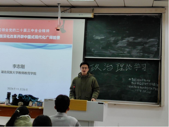本网讯(通讯员 杨雯俪 张蓉)11月26日,教师教育学院团总支书记李志刚在9B401为学院团员青年开展《学习党的二十届三中全会精神——进一步全面深化改革开辟中国式现代化广阔前景》专题宣讲。