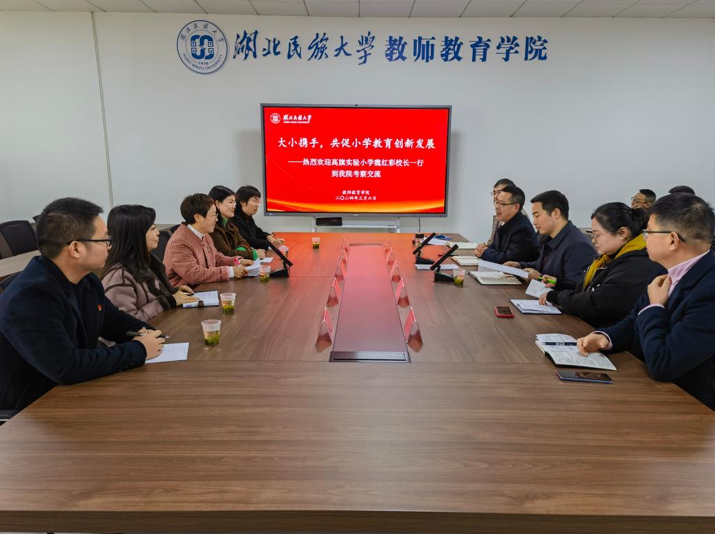 3月6日上午,恩施市高旗实验小学校长魏红彩一行到教师教育学院考察交流,学院党总支书记宁华宗、院长谭华及分管领导、科室负责人和教师代表参加活动。双方围绕“大小携手 共促小学教育创新发展”的主题进行了讨论交流,座谈会由谭华主持。