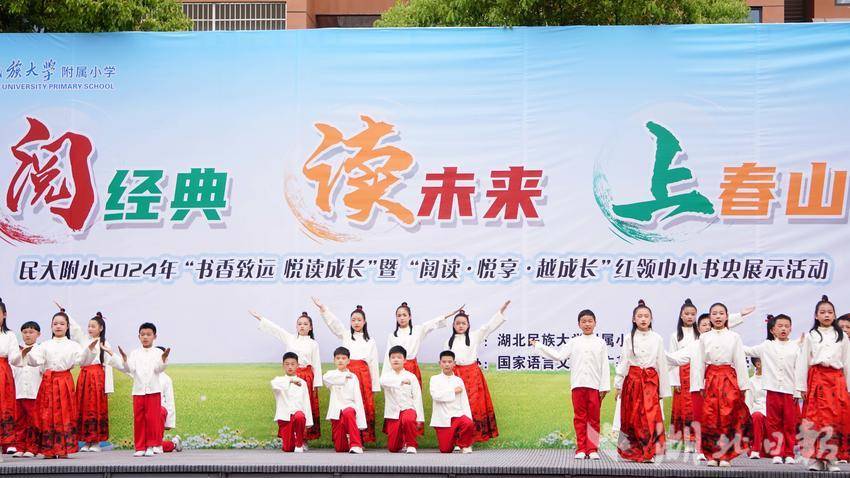 实验小学活动现场,学生头戴小黄帽、手持各色自制纸飞机随校歌音乐摇摆。情景歌舞《清江村居·诗漫春山》中,表演者身着土家族服饰用土家语歌唱诗书之美,现场书写毛笔字,呈现恩施州独特的山水诗意;读书分享《读经典、育新人》采用师生问答形式,教导学生多读书、读好书,在一问一答间淋漓展现“经典育人”理念;群口相声《比读书》通过说、学、逗、唱切磋学问,表演者身着中国红马面裙执笔起舞,展现欣欣向荣的阅读情景。金年会语言艺术团成员朗诵《生活中英雄们的中间》,追忆抗美援朝英雄张卫良,通过情景再现形式演绎英雄事迹,呼吁学生敬畏英雄、珍惜当下、建设美好家园。