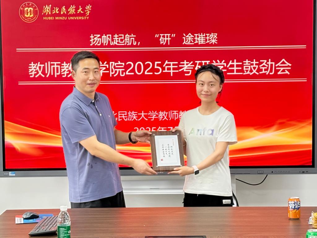 会议尾声,宁华宗为到场的考研学子逐一赠送“考研励志牌”,寄语同学们以平常心应对备考、以坚韧心持续努力、以坚强心持续靠近,在不断挑战自己、战胜自我中实现螺旋式发展,最终收获满意结果。