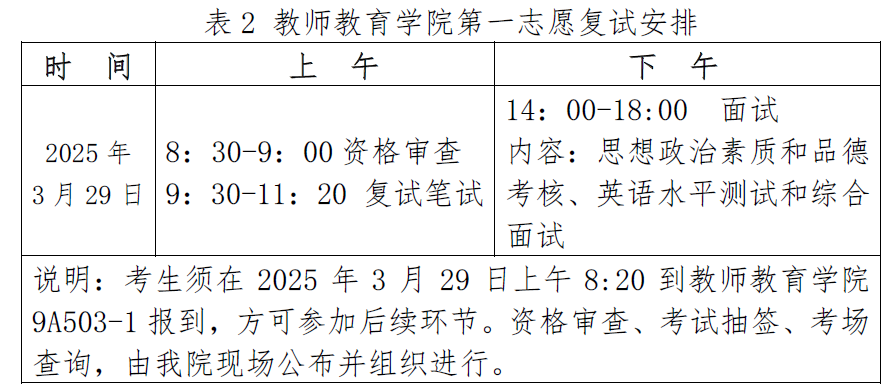 第一志愿复试时间定于2025年3月29日上午8:20开始,具体日程安排见表2。调剂复试将在第一志愿复试后安排,具体通知见本院网站(/jyxy/)公布的调剂公告。