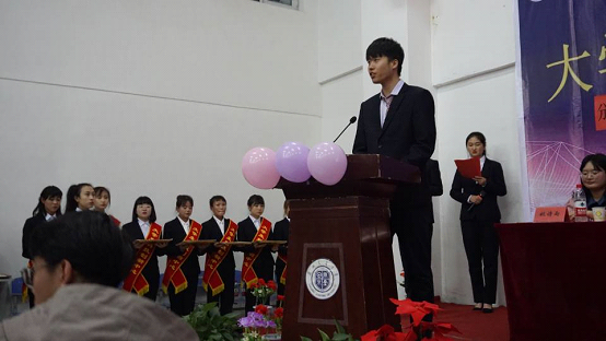 第四届大学生科技创新中心主任马梓翔同学做了工作总结,马梓翔同学以亲身经历诠释了他在科创中心的成长、成熟,他告诉大家要团结一心,要有不怕苦不怕累的精神,开展活动要精心准备,只有坚持不懈的努力才能走向成功。