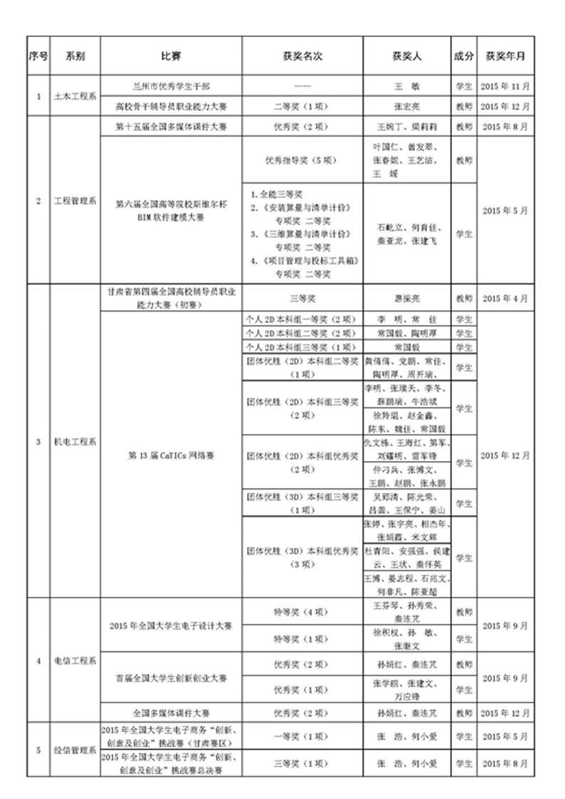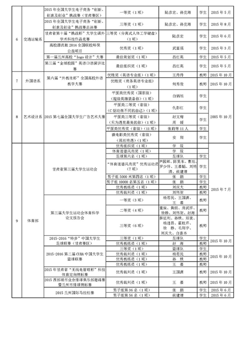 兰州交通大学博文学院2015年各系部师生院外获奖情况统计表