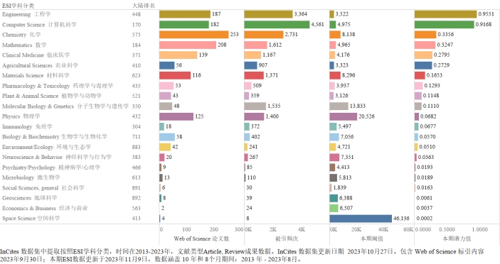 InCites 数据集更新日期 2023-10-27. 包含 Web of Science 标引内容截止 2023-09-30。时间在2013-2023年,文献类型Article, Review成果数据