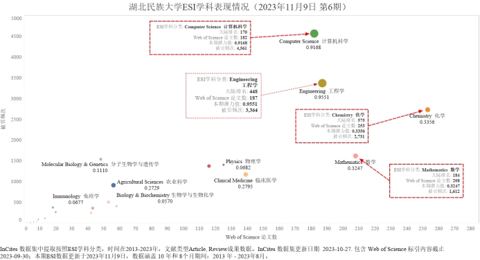 由于InCites 数据集更新于2023-10-27. 包含 Web of Science 标引内容截止 2023-09-30。晚于ESI数据涵盖数据范围2023年8月31日,因此实际发文量和引用量略有增加,会导致潜力值比实际略微偏高。因此尽管湖北文理学院Engineering工程学和中南民族大学Computer Science计算机科学本期潜力值大于1,但仍尚未入围ESI学科前1%