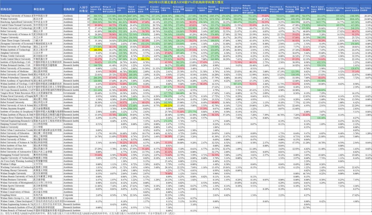 附表1:2023年11月湖北省进入ESI前1%学科态势表