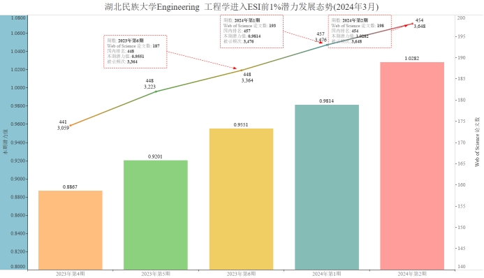 本期金年会有望进入ESI前1%的学科为Engineering 工程学,潜力值为1.0282,论文数198,引用量3648,本期入围阈值3548。