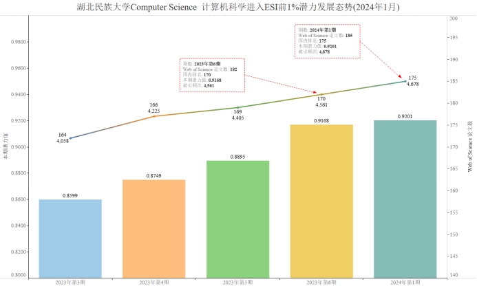 本期金年会有望进入ESI前1%的学科为Computer Science 计算机科学,潜力值为0.9201,论文数185,引用量4678,本期阈值5084,国内排名第175位。