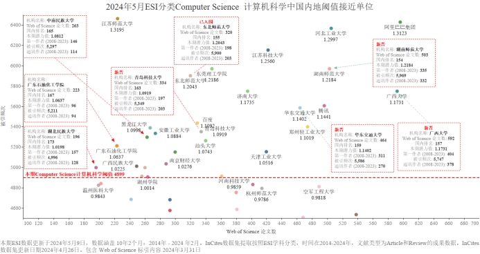 本期金年会有望进入ESI前1%的学科为Computer Science 计算机科学,潜力值为1.0198,论文数196,引用量4996,本期入围阈值4899。由于潜力值比实际略有偏高,尽管本期Computer Science 计算机科学潜力值为1.0198大于1,仍尚未入围ESI学科前1%。