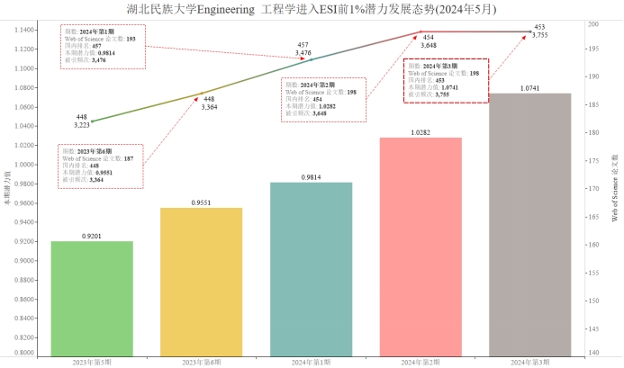 本期金年会有望进入ESI前1%的学科为Engineering 工程学,潜力值为1.0741,论文数198,引用量3755,本期入围阈值3469。由于潜力值比实际略有偏高,尽管本期Engineering 工程学潜力值为1.0741大于1,仍尚未入围ESI学科前1%。