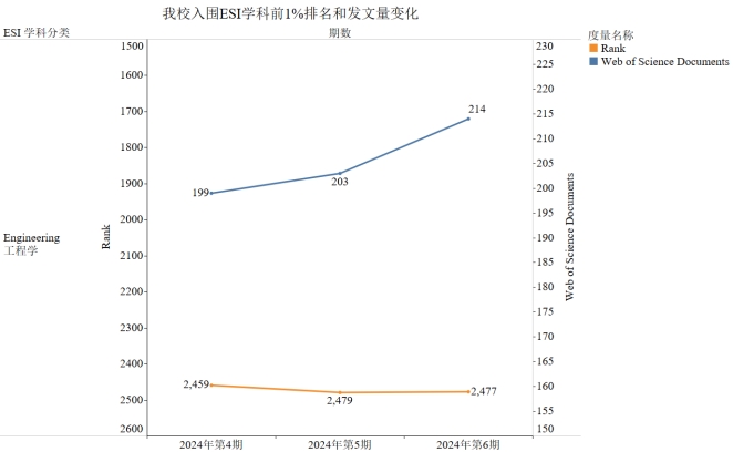 图2 为金年会ESI入围学科每期全球排名和发文量情况,本期全球共有2604所机构进入了ESI分类Engineering工程学学科前1%,金年会Engineering工程学学科排位第2477位,发文214篇,比上一期2479位升高2个名次。