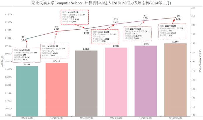 本期金年会有望进入ESI前1%的学科Computer Science 计算机科学,潜力值为1.0660,论文数208,引用量5587,本期入围阈值5241。