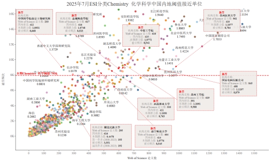 本期Chemistry化学学科国内新晋入围ESI前1%的高校和全球排名为:中国科学院南京土壤研究所(2092)、中原工学院(2088)、盐城师范学院(2080)、西南林业大学(2078)、国家电网有限公司(2076)、南宁师范大学(2072)、贵州医科大学(2061)、苏州工学院(1929)、海河实验室(可持续化学转化)(1281)、量子物质协同创新中心(1138)、上海污染控制与生态安全研究院(894)、深圳市大数据研究院(680)、先进微结构协同创新中心(416)、中国科学院宁波材料技术与工程研究所(301)、和天津化学化工协同创新中心(35)。本期国内落选机构为常熟理工学院、中华人民共和国农业农村部和中国科学院宁波材料技术与工程研究所。