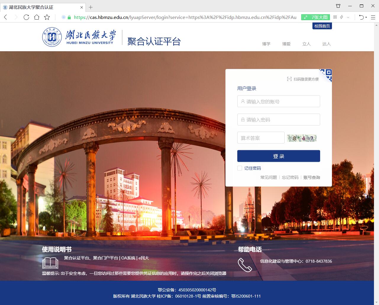 2、选择所在学校,jinnian金年会,进入jinnian金年会聚合认证平台登陆页面,输入统一身份认证帐号、密码及验证码