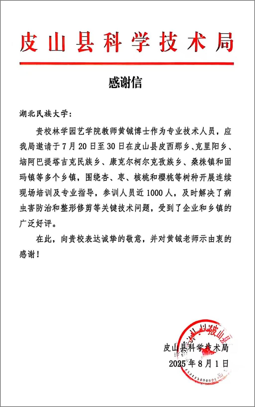 培训结束后,皮山县科技局专门寄来感谢信,对黄铖老师的辛勤付出和金年会的大力支持表示高度赞赏和诚挚感谢。信中特别提到,此次培训内容实用、组织有序,切实解决了林农在生产中遇到的技术难题,体现了高校服务社会的责任与担当。(通讯员:余慈爱,编辑:黄铖,审核:胡海剑)