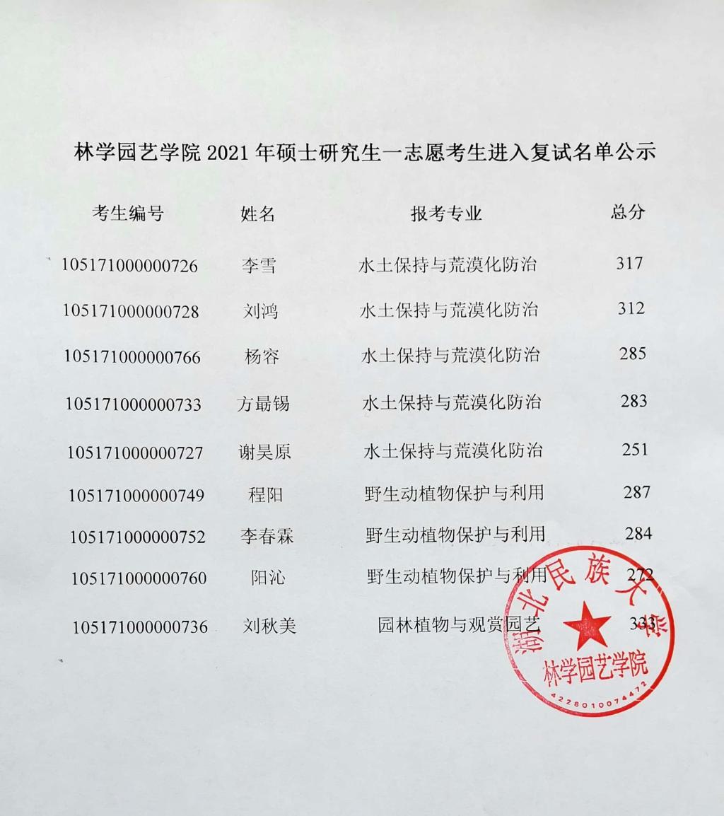 林学园艺学院2021年硕士研究生一志愿考生进入复试名单公示