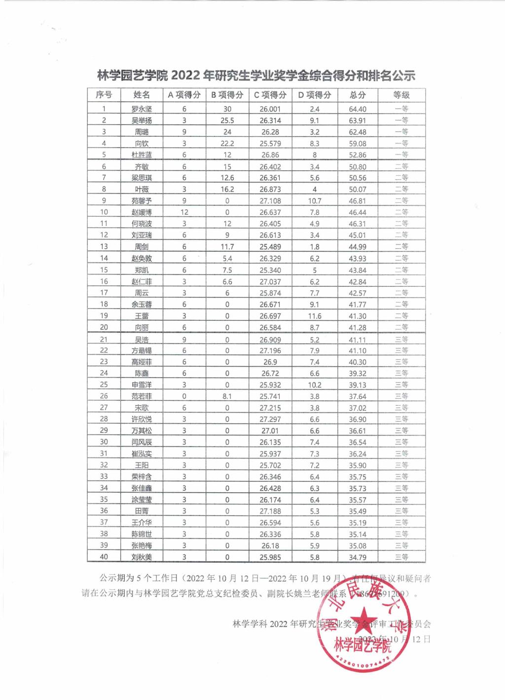 林学园艺学院2022年研究生学业奖学金综合得分和排名公示