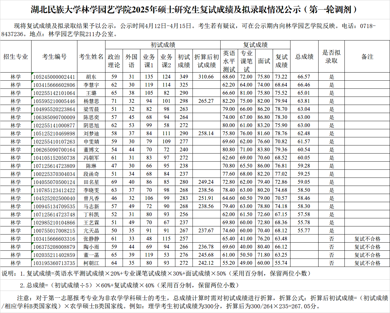 林学园艺学院2025年硕士研究生招生复试成绩与拟录取名单公示(第一轮调剂)