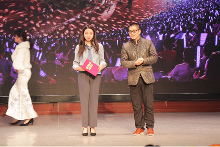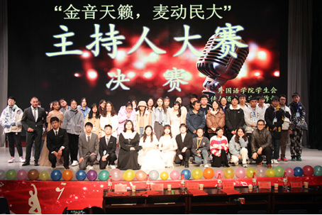 本网讯(见习通讯员 姜依维 郑爽 通讯员 毛玉梅/文 见习通讯员 秦悦 阮欣欣/图 )11月29日晚,我院学生会宣传与语言文字工作部联合外国语学院在音舞演播厅举办以“金音天籁,麦动民大”为主题的主持人大赛决赛。外国语学院学生科科长粟登平,我院团总支书记刘桃元,外国语学院学生科教师田甜,我院学生会主席徐颢文,外国语学院学生会主席余红霞及广播台负责人徐芙蓉应邀出席并担任大赛评委。两百余名学生到场观赛。