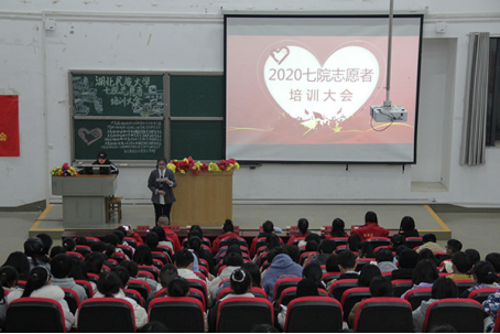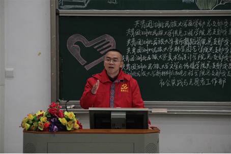 本网讯(通讯员 雷文欣 毛玉梅 见习通讯员 郑爽/文 通讯员 胡万琴/图)为促进各二级学院志愿者的沟通与交流,进一步激励青年志愿者们积极参与志愿服务活动。11月28日晚,我院团总支社会实践与志愿者工作部联合文学与传媒学院、信息工程学院、医学部等七个二级学院在修远楼5A207教室举办以“烽火相传志愿者,暖意长存人心处”为主题的青年志愿者培训大会。恩施义工协会严书田、谭鸿、谭艳红、江新、陈崇润、赵娟受邀出席会议,严书田担任主讲人。