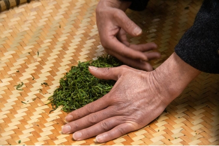杀青、揉捻、干燥等工序由负责金年会茶园管理的高级技工周志顺为学生进行示范,随后由学生自主完成。杀青过程由学生接力进行翻炒,直至茶叶由硬变软,逐渐变为暗绿色,折而不断,手捏成条。牟蛟琳指出,杀青能够去除茶叶中低沸点的青臭气味,保留高沸点的挥发性成分,使绿茶散发独特的茶香。杀青后的茶叶再进行充分揉捻使之成型,最终经过多次干燥、晾干使茶叶水分降低至5%左右,从而获得成品茶。