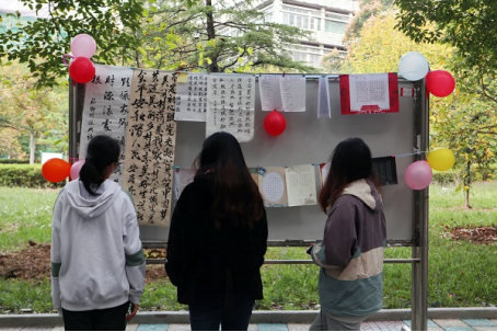 本网讯(见习通讯员 李美玲 通讯员 涂家慧/文 见习通讯员 吴文均/图)11月7日,我院学生会宣传与语言文字工作部在学院前空地举办以“千年夙愿今圆梦,乡村振兴谱新篇”为主题的迎新书画赛作品展览。