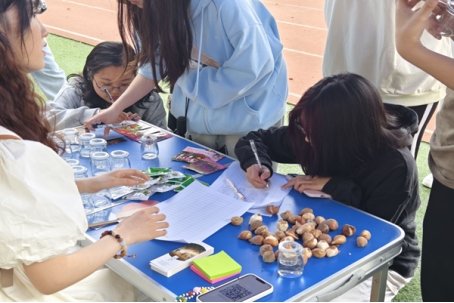 活动开始,学生在民族体育场领取由工作人员提供的郁金香、虞美人和满天星的花种,根据喜好挑选种子,并在明信片上写下自己对未来的美好寄托。后续学生可在一个月观察并记录花的生长过程,上传至活动群。现场氛围浓厚,学生积极参与。