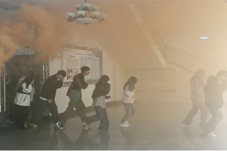 随着火灾报警系统响起,各应急小组人员分工合作,组织师生迅速疏散撤离。在疏散人员的引导下,全体师生按照预案培训的“火场”逃生疏散演练技巧,用湿毛巾捂住口鼻,低姿通过疏散路线,安全、高效、有序的完成撤离,几分钟后学院楼内师生已全部撤离到达室外集合地点。