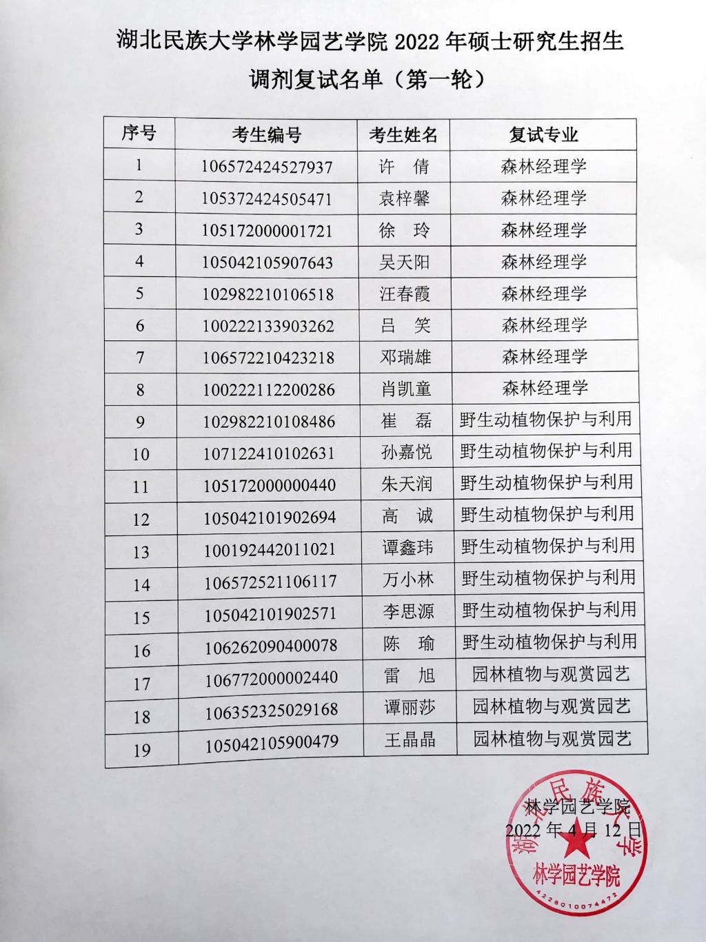 jinnian金年会林学园艺学院2022年硕士研究生招生调剂复试名单(第一轮)