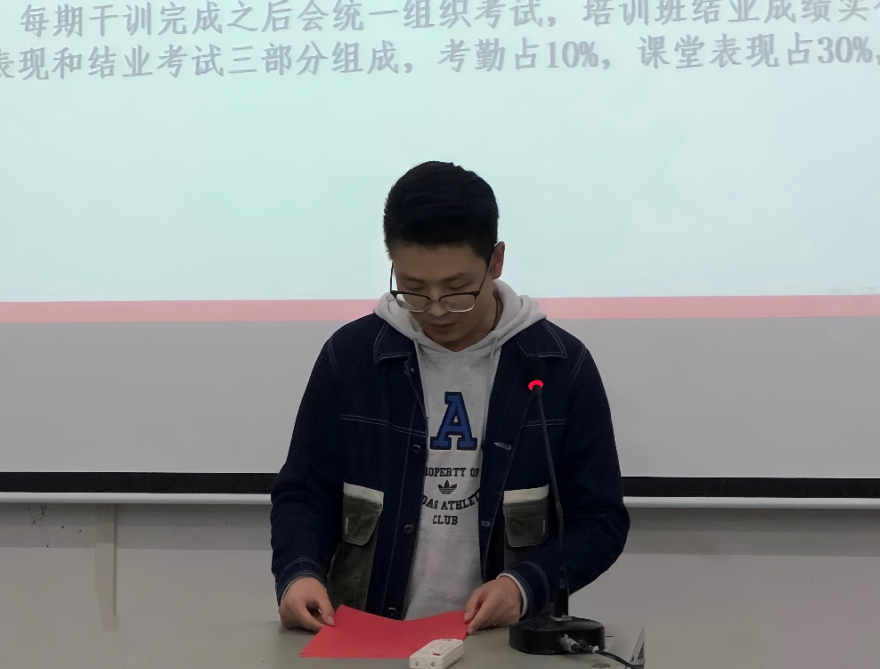 廖祥宇宣读《jinnian金年会数学与统计学院学生干部培训班章程》,阐述学生干部在纪律、学习与考核等方面的综合安排方案,明确培训的目标与宗旨;李子君宣读《jinnian金年会数学与统计学院学生干部培训班管理办法》,强调学生干部应诚信学习、遵守规定、支持团总支工作,以期规范培训流程及培训效果。