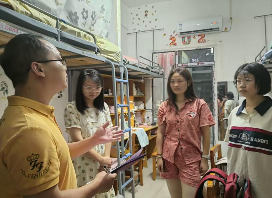 本网讯(记者 尚者/文 向桂林/摄)为帮助2023级新生尽快适应学校生活环境,9月9日晚,我院党总支书记赵魁轩、2023级新生班主任、学生科副科长黄丽娜、辅导员刘聪、廖祥宇以及学生党员和公寓管理委员会干部开展新生寝室走访活动。