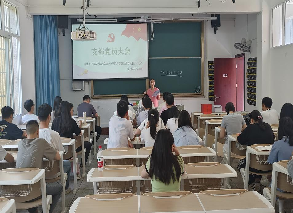 本网讯(记者 闵小玉/文 闵小玉/摄)2024年5月23日下午,数学与统计学院学生第一党支部与学生第二党支部在3205教室举办主题为“矢志不渝守初心,砥砺前行担使命”5月支部主题党日活动。本次活动由学生第一党支部书记黄丽娜主持。