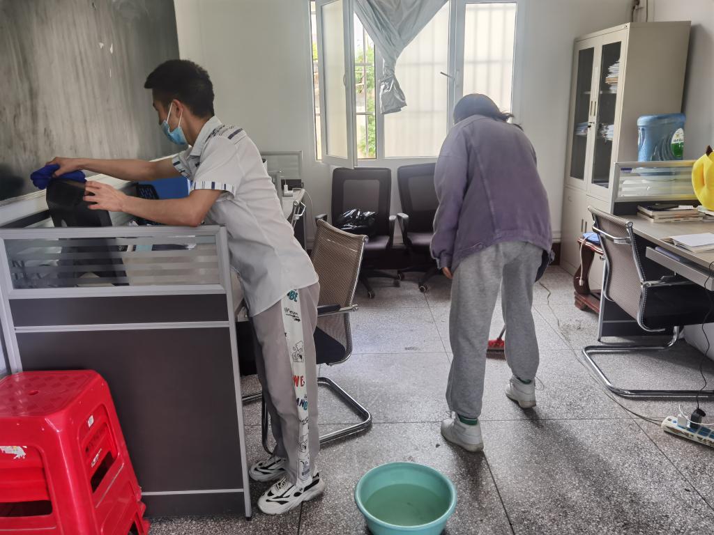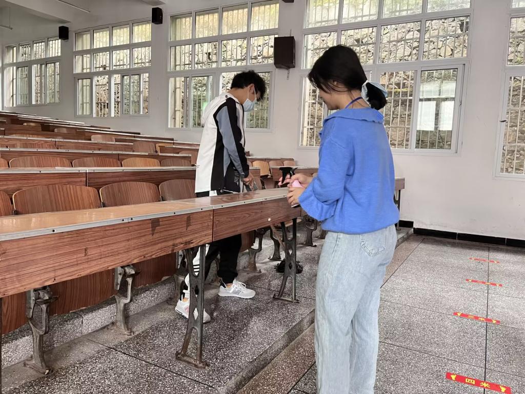 我院学生干部为守护学校师生的健康安全积极贡献着自己的力量。对我院各个办公室、教室、卫生间、走廊、楼道等进行全方位细致的消毒。消杀过程中,工作人员戴好口罩、做好防护,用消毒液兑水拖地、酒精喷雾给桌椅消毒,实现全覆盖,确保不留死角、消杀彻底。为师生的安全保驾护航,给全体师生营造一个安全、健康、卫生的教学与学习环境,为我院结束线上教学,恢复线下教学做了充分的准备。
