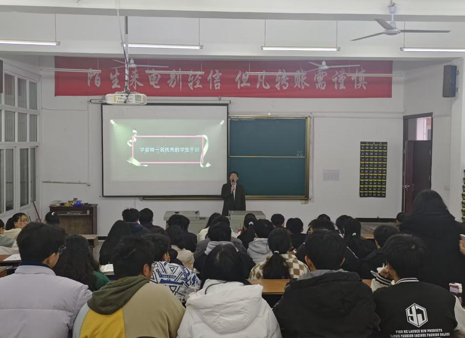 授课伊始,刘聪老师就如何成为一名优秀的学生干部,作进一步进行拓展,让同学们了解其应具备的精神面貌,把握关键及肩上的责任。