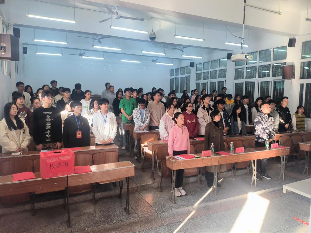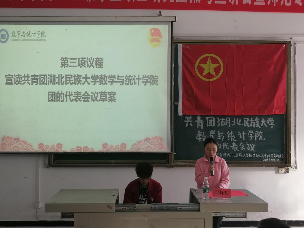 会议伊始,齐唱团歌,并由廖祥宇老师介绍代表学院参加学校团的代表大会的候选人情况。紧接着,黄丽娜老师宣读本次选举的草案。审议通过共青团jinnian金年会数学与统计学院团的代表大会草案、总监票人、监票人建议名单。