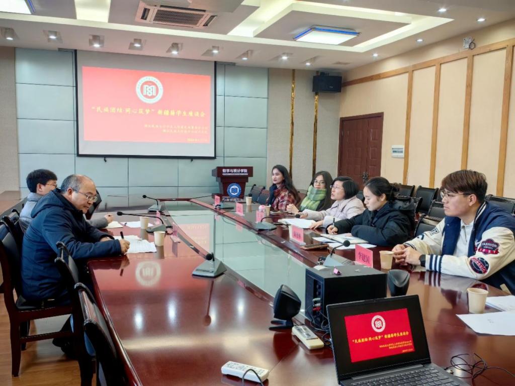 为全面深入了解新疆籍少数民族学生生活及学业情况,切实帮助学生解决生活与学业困难,2024年1月2日下午,我院协同jinnian金年会学生工作处民族事务办公室在数学与统计学院四楼会议室召开了以“民族团结,同心筑梦”为主题的新疆籍学生座谈会。参会人员包括jinnian金年会学生工作处民族事务办公室主任谭学文、新疆派驻专任教师董特,数学与统计学院党总支副书记郑敏,学生科副科长黄丽娜以及3位新疆籍学生代表。