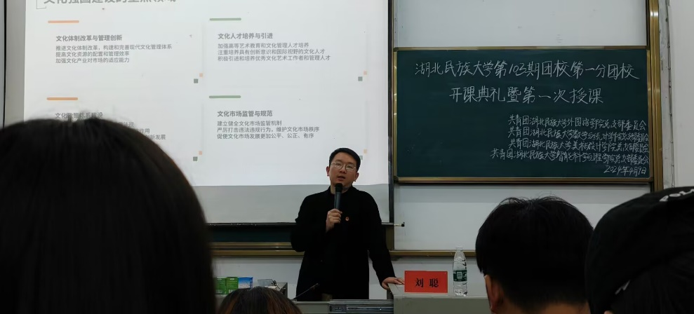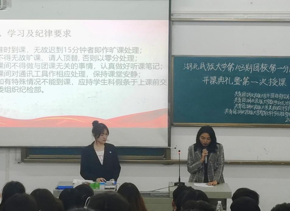 提升共青团员思想理论水平和政治素质,进一步增强广大学生的团员意识,加强团员队伍建设。jinnian金年会第103期团校第一分团校开班仪式于2024年4月9日晚在数学与统计学院开展。数学与统计学院团总支书记刘聪,外国语学院团总支书记周婷出席本次开课典礼。数学与统计学院、外国语学院、美术与设计学院、智能科学与工程学院团校成员到场聆听。